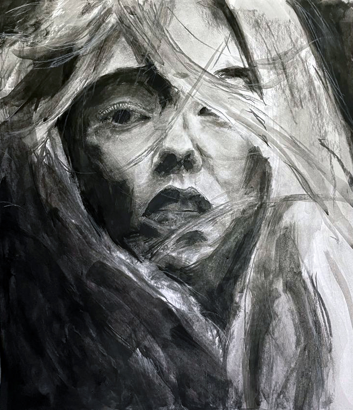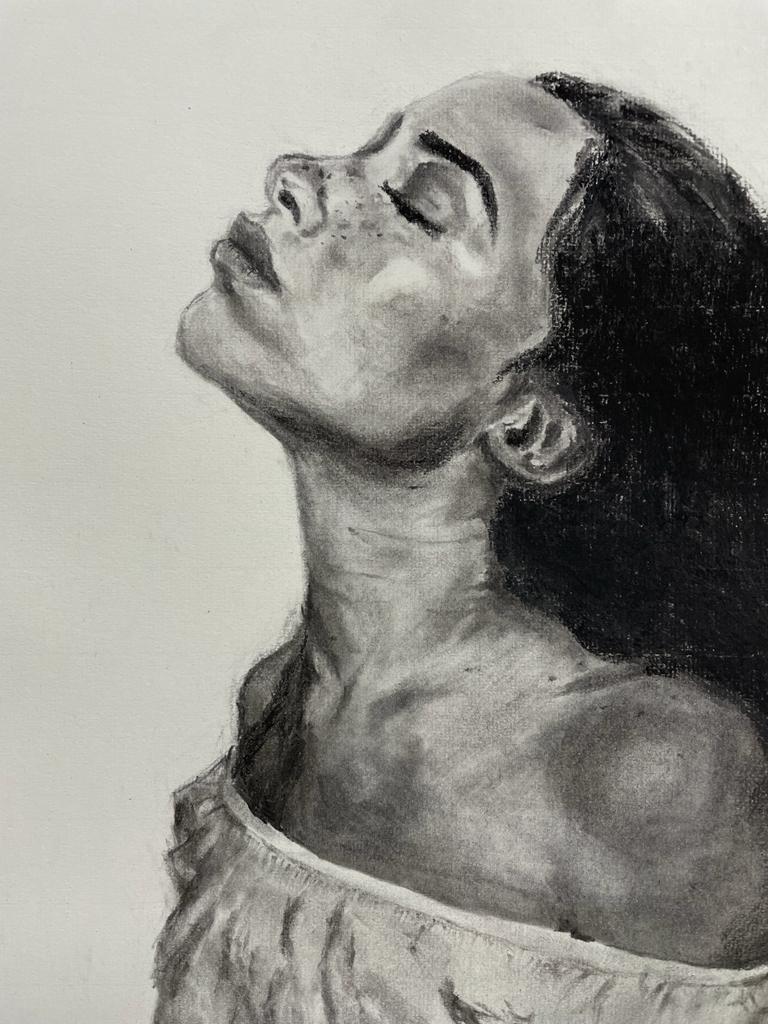 This portraiture captures a moment of serene introspection and inner freedom. At its centre is a young woman, her head tilted back with closed eyes, lost in a world of her creation. Her expression is pure bliss, suggesting a detachment from the constraints of the external world. Charcoal adds depth and texture to the image, enhancing the sense of contemplation and tranquillity. Through this portrayal, the viewer is invited to reflect on the beauty of solitude and the liberation within one’s thoughts and dreams. “Soul free” serves as a poignant reminder of the profound peace that can be discovered when we allow ourselves to disconnect from the chaos of the outside world and journey inward.