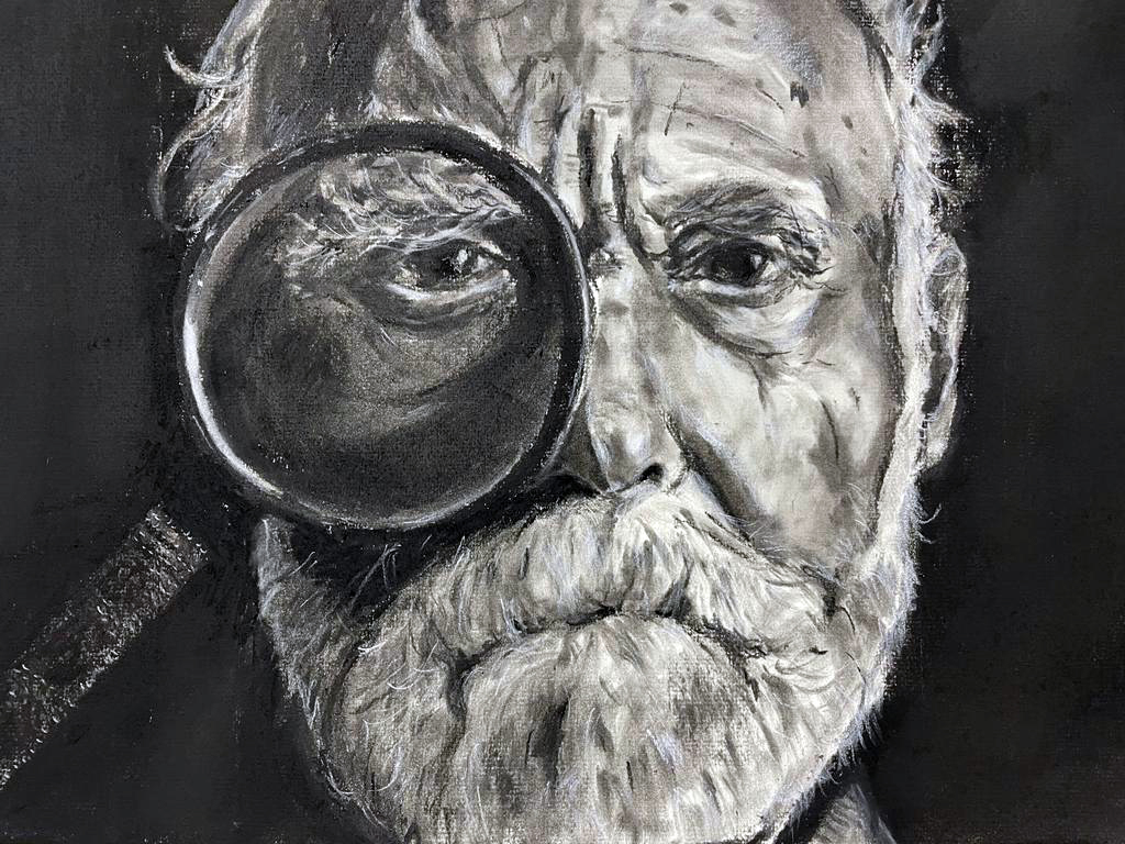 “Through the Looking-Glass” is a poignant charcoal rendering capturing the essence of lifelong curiosity and perpetual wonderment. In this compelling piece, an elderly man adorned with a crown of white hair gazes intently through a magnifying glass with one eye. Despite the passage of time and the weight of years reflected in his visage, his insatiable curiosity is evident. The man’s enduring thirst for knowledge suggests that even in the twilight of life, he remains engaged with the world, seeking to unravel its mysteries until his last breath. Through the subtle interplay of light and shadow, the drawing conveys a sense of depth and complexity, inviting viewers to contemplate the timeless pursuit of understanding and the boundless capacity of the human spirit for exploration. “Through the Looking-Glass” is a powerful reminder that curiosity knows no age limits, inspiring us to embrace a lifelong journey of discovery and enlightenment.